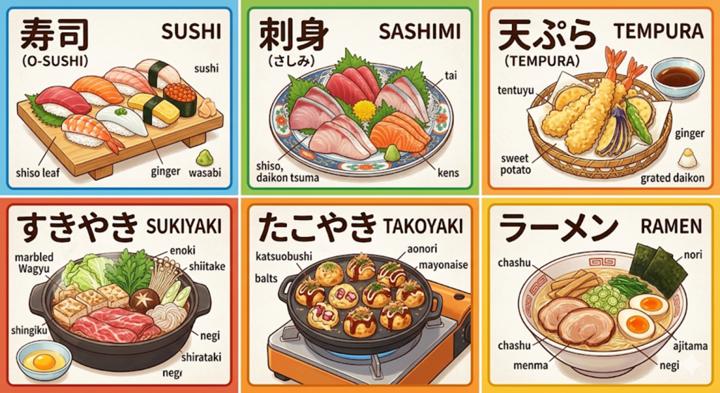 寿司、刺身、天ぷら、すきやき、たこやき、ラーメン。
