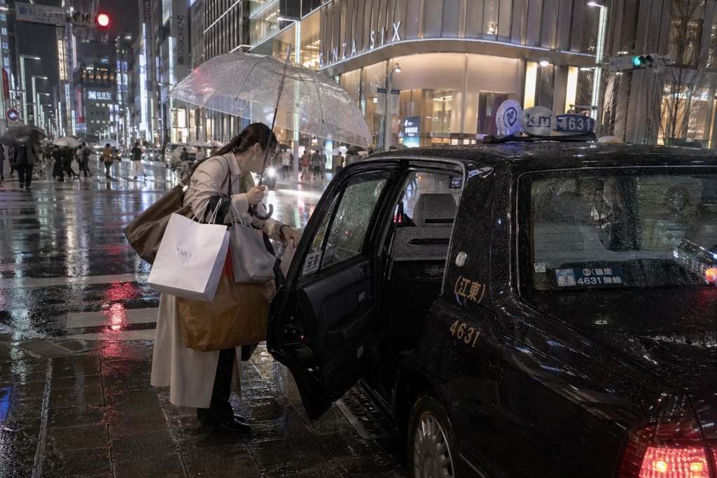 荷物も多いし、雨も降っているし、タクシーに乗ります。