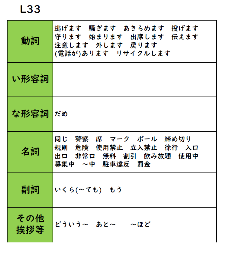 みんなの日本語 33課 教案 導入 例文 イラスト 日本語 X Facebook はてブ Pocket LINE コピー 2026.04.222026.04.30 《学習目標》 できるようになること ・指示、命令を理解することができる。 ・伝言したり、人の発言を伝えたりすることができる。 目次 新出語彙命令形禁止形「~」と書いてあります/読みます~は~という意味です~と言っていました~と伝えていただけませんか 新出語彙 ★ポイント 命令形 禁止形 「~」と書いてあります/読みます ~は~という意味です ~と言っていました ~と伝えていただけませんか