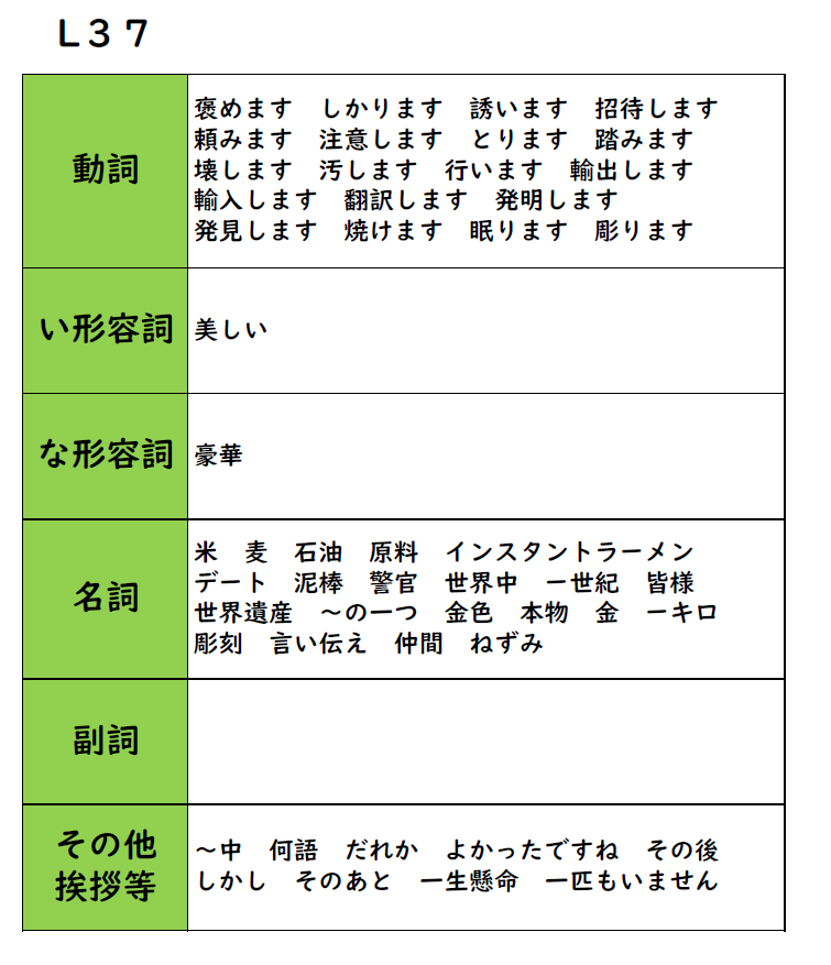 みんなの日本語 37課 導入 例文 イラスト 日本語 X Facebook はてブ Pocket LINE コピー 2026.04.222026.04.30 《学習目標》 できるようになること ・人から受けた行為や迷惑に感じた体験を受身表現を使い、話者の視点から話せる。 ・物事の状況や事実を受身表現を使って説明できる。 目次 新出語彙<人>は~に[~を]~(ら)れます<人>は~に<所有物>を~(ら)れます<物>が/は~(ら)れます 新出語彙 ★ポイント <人>は~に[~を]~(ら)れます <人>は~に<所有物>を~(ら)れます <物>が/は~(ら)れます