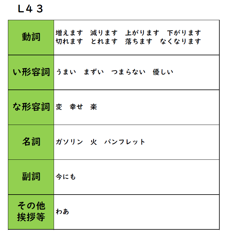 みんなの日本語 43課 教案 導入 例文 イラスト 日本語 X Facebook はてブ Pocket LINE コピー 2026.04.232026.04.30 《学習目標》 できるようになること ・物事の外観から、その変化の見通しや状態・性質を推察して表現できる。 ・目的の行為を終えて、元の場所に戻ることが伝えられる。 目次 新出語彙~そうです(動詞)~そうです(形容詞)~て来ます 新出語彙 ★ポイント ~そうです(動詞) ~そうです(形容詞) ~て来ます