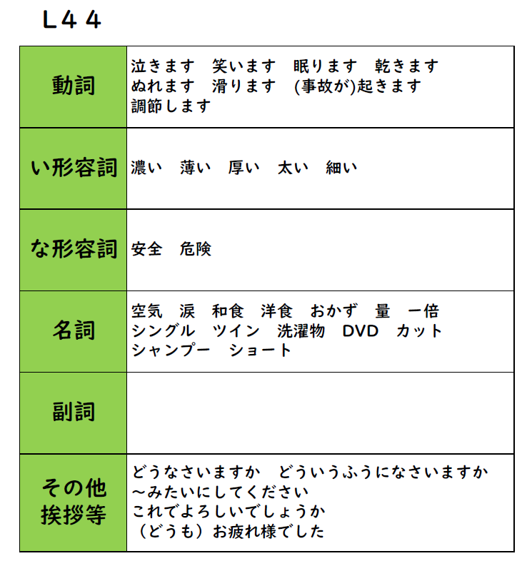 みんなの日本語 44課 教案 導入 例文 イラスト 日本語 X Facebook はてブ Pocket LINE コピー 2026.04.232026.04.30 《学習目標》 できるようになること ・動作や程度の度を越し、好ましくない状態になったことが言える。 ・物を使用する際の難易度を示すことによって、その物の表が表せる。 ・自分の選択、決定を伝えることができる。 目次 新出語彙~すぎます~やすい/にくいです~く/にします~にします 新出語彙 ★ポイント ~すぎます ~やすい/にくいです ~く/にします ~にします