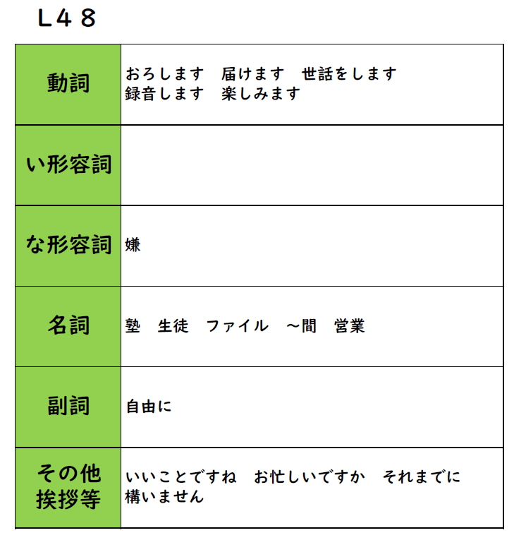 みんなの日本語 48課 教案 導入 例文 イラスト 日本語 X Facebook はてブ Pocket LINE コピー 2026.04.232026.04.30 《学習目標》 できるようになること ・他者(下位の者)への行為の強制や許可・容認を表すことができる。 ・丁寧に許可を求めることができる。 目次 新出語彙~(さ)せます(強制)~(さ)せます(容認)~(さ)せていただけませんか 新出語彙 ★ポイント ~(さ)せます(強制) ~(さ)せます(容認) ~(さ)せていただけませんか