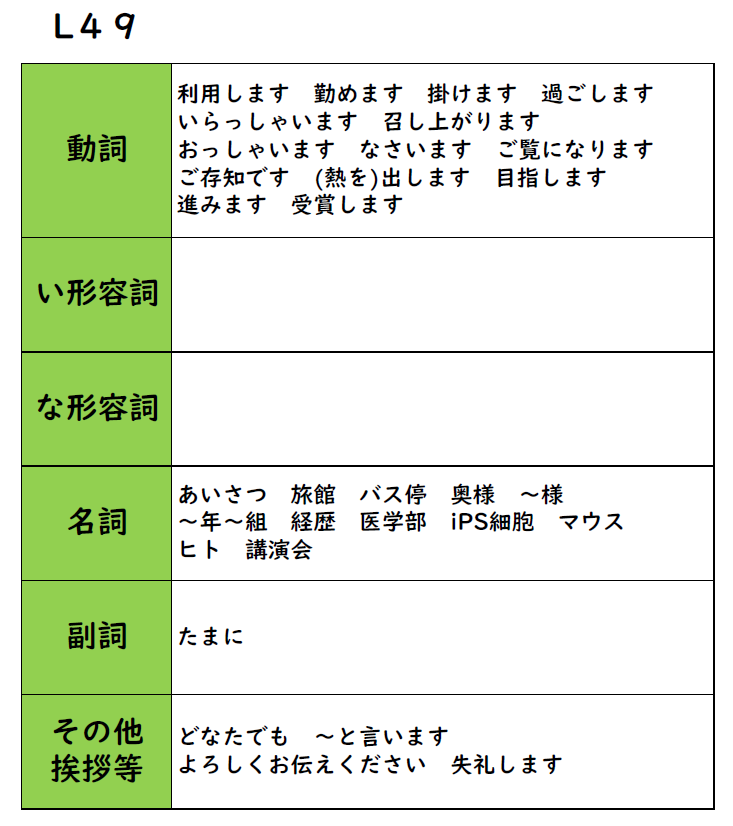 みんなの日本語 49課 教案 導入 例文 イラスト 日本語 X Facebook はてブ Pocket LINE コピー 2026.04.232026.04.30 《学習目標》 できるようになること ・「上下」「親疎(ウチ・ソト)」の人間関係に基づく尊敬語の表現を理解し、適切に使うことができる。 目次 新出語彙~(ら)れますお~になります特別な尊敬語お/ご~ください 新出語彙 ★ポイント ~(ら)れます お~になります 特別な尊敬語 お/ご~ください